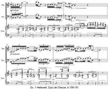 Music – like all performed arts – relies on an unspoken contract between performer and audience that pretends everything is happening spontaneously. In the theatre we have to be persuaded that the words being spoken are a character’s immediate response to on-stage events, even though we know that the words were written down by a playwright, committed to memory by the actor during a process of rehearsal and spoken more or less the same way every evening. Nonetheless as an audience we are complicit participants in the myth; the actors in a play, for example, do not deny that they rehearse we in the audience do not claim to be there by accident. The theatre of a musical concert is also charged with suggestions of the spontaneous: the pianist who sits alone at a piano and starts to play, apparently prompted only by a sudden thought, or – even more magically – the conductor who looks up and with a wave of his arms conjures music into being. But classical musicians walk a tightrope; audiences and critics alike are unhappy if performers get notes wrong – but castigate them if their reading is too predictable. But where Baroque continuo and classical concertos require improvisation, modern composers have become ever more precise – even tyrannical – about everything in their scores. Some composers, though, manage to compose this spontaneity into the music. Andriessen and Schönberger wrote of Stravinsky that ‘even though the musical thought is fixed and every performance will sound more or less the same, the thought itself can nonetheless give the impression of being improvised – as if arising out of the playing itself.’ What is it that gives this quality to the music? There are some delightful answers – and games with those answers – in Piers Hellawell’s Cors de Chasse, a double-concerto for trumpet, trombone and orchestra from 2004. Improvisation, or quasi-improvisation, is unpredictable, asymmetric, quixotic, rich in diversions and dead-ends, liberal, pragmatic, imaginative and unsystematic. Hellawell’s piece has all these attributes and more. There are nods to bebop jazz, specifically in jagged, lightning-fast figuration, piercing rips and flickering licks, and ornamentation of slower melodic lines. The music often feels like it doesn’t know where it’s going, but is enjoying the ride. Its wealth of invention carries the music forward. Hellawell’s twist is to have two instruments share in the improvisation. The tension of the myth of spontaneity is stretched by having two instruments improvise together in duet. The soloists’ first entry is a hectic hocket; at other times they pass a single melodic line, alternating freely. At other times there is a Stravinskian ‘heterophony gone wrong’ – the lines shadowing each other, diverging occasionally. But the most exhilarating moments are when the trumpet and trombone double each other exactly, matching each other phrase for phrase, flourish for flourish, like synchronised tightrope-walkers throwing hand-stands in perfect co-ordination – and with extra marks for style (Ex.1).